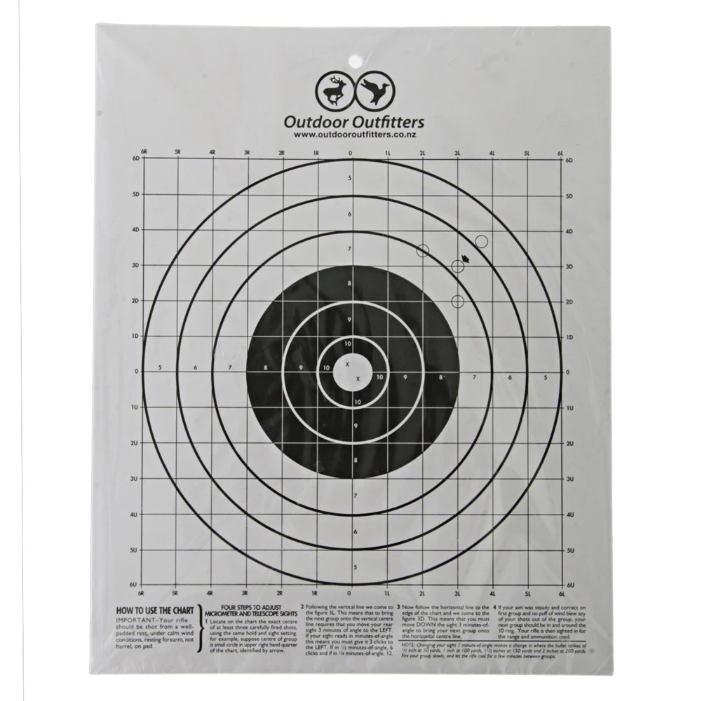 The Outdoor Outfitters Cardboard Target perfect for practicing your aim or adjusting your telescope sights. Can be used for shooting indoors or outdoors as well as short range or long range. This shooting target is ideal for all firearms and calibres including Airsoft, BB guns, pellet guns, air rifles and shotguns.