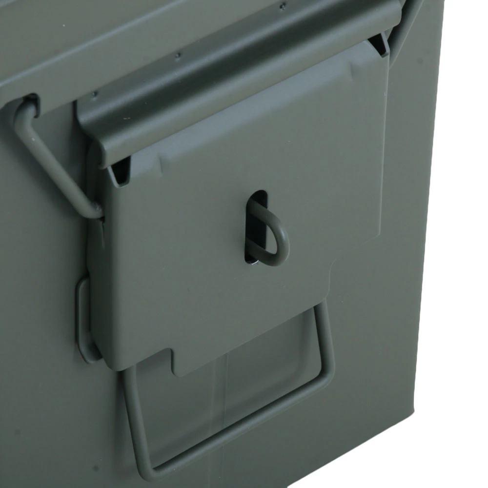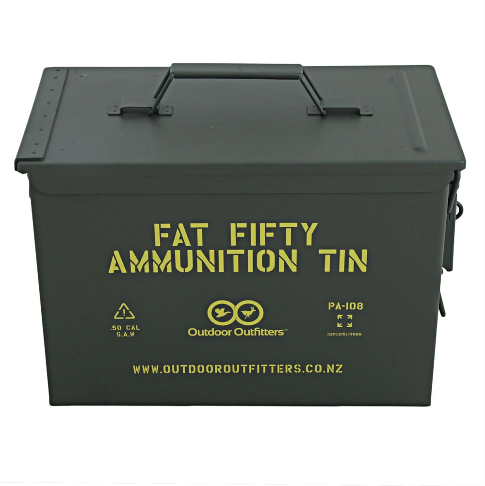 Commonly referred to as the Fat Fifty tin but used for grenades, or 556 MM blanks, the Outdoor Outfitters Fat Fifty Ammo Box can be used around the home, shop or range. It features sturdy steel construction, removable lid, and watertight seal. Items inside remain safe and dry even when tin is buried.