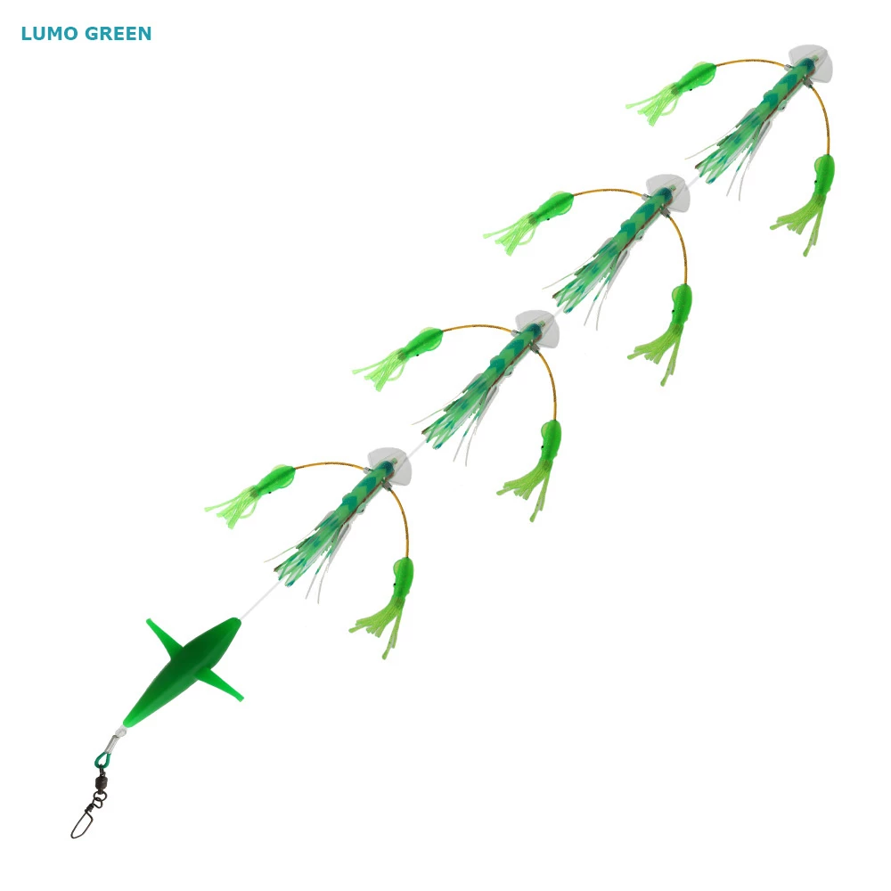A unique variation to the traditional squid daisy chain, the Pakula Series Squidnation That Flippy Floppy Thing Daisy Chain features a flexible bar through each squid tipped with two smaller squids – creating a floppy movement that mimics a critter driving through a school of fish and scattering a bunch of bait in the air.